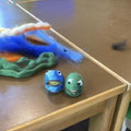 Bei typisch norddeutschem und schmuddeligem Wetter nutzten wir die Gelegenheit und gestalteten den Spieleraum kreativ um. Eifrig entstanden Igel, Eichhörnchen, Fliegenpilze und zu Halloween passende (mehr oder weniger;)) gruselige Fledermäuse und kleine Mumien. Malen, ausschneiden und kleben waren jedoch nicht die einzigen Methoden, denn die Kinder lernten in ersten Schritten auch das Filzen.
